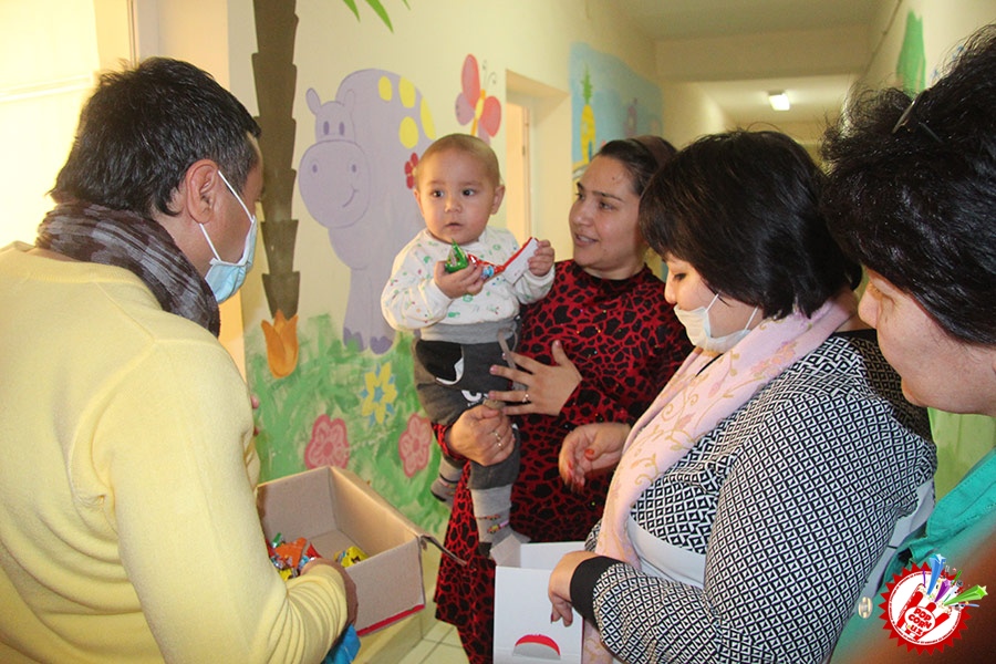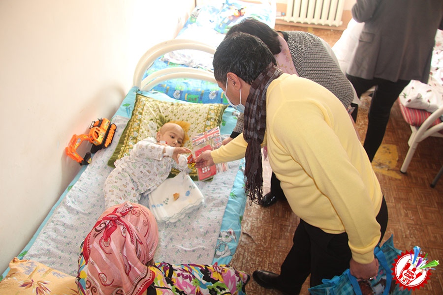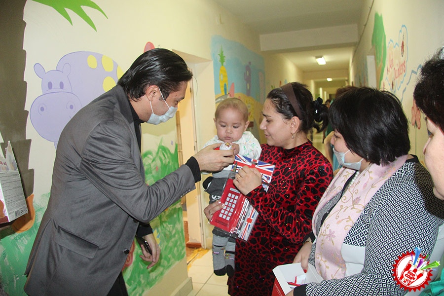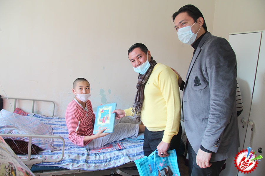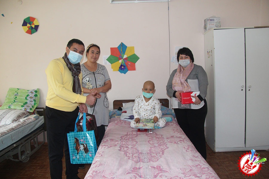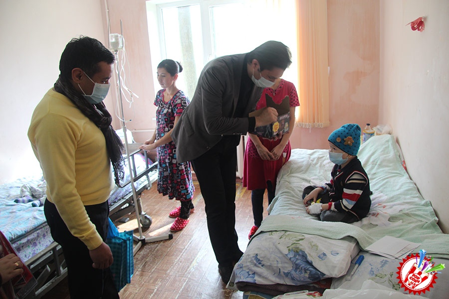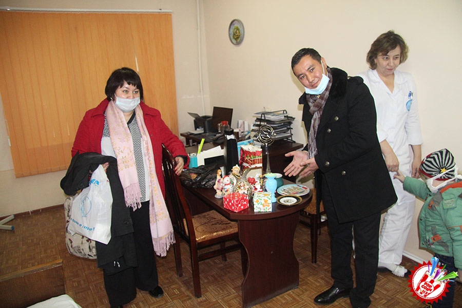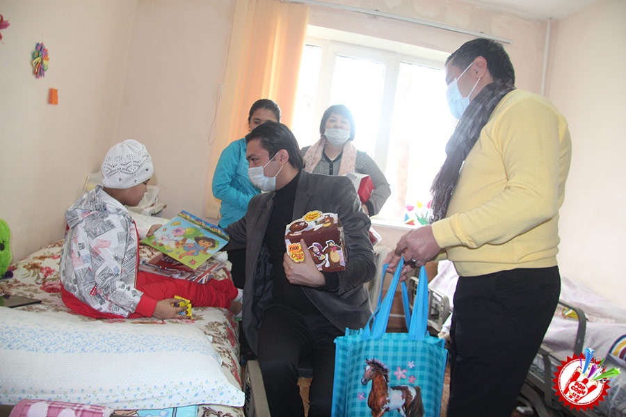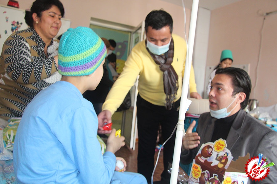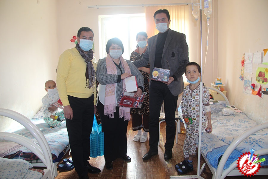 Кўп ўтмай касалхонага ташриф буюриб бўлим бошлиғи Наргиза Нусратуллаева билан юзлашдик. Тадбирга бир қанча инсонлар ташриф буюришган бўлса-да, беморлар хонасига тўрт кишига рухсат берилди. Ички тартиб қоидага итоат этган ҳолда, юзимизга ниқоб тақиб ичкарига кирдик. Мазкур тадбир ташкилотчиларидан бири, чет тилларига ихтисослаштирилган ўқув маркази раҳбари Шаҳноза Шарипова, актёр ва юрист Отабек Маҳкамов, хонанда Абдумалик Тотли ҳамда сайтимиз ҳодими томонидан келтирилган бир қатор совғалар, жумладан, китоблар, футболкалар ва ширинликлар бўлимдаги барча бемор болажонларга топширилди.