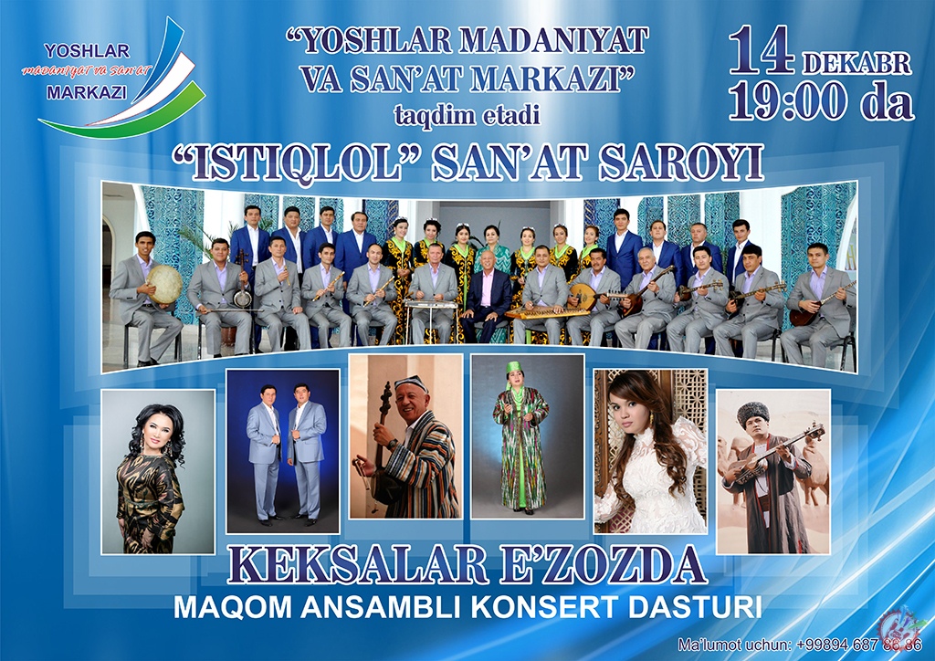 Ўзбекистон Республикаси маданият ва спорт ишлари вазирлиги, Ёшлар маданият ва санъат маркази томонидан жорий йилнинг 14-декабрь куни, соат 19:00да “Истиқлол” санъат саройида, мақом ансамблининг “Кексалар эъзозда” деб номланган концерт дастури бўлиб ўтади. Дастурида мақом санъати усталари ҳамда эл ардоғидаги устоз санъаткорлар иштирок этади. Бизни кузатишда давом этинг ва янгиликлардан биринчилар қаторида хабардор бўлинг.