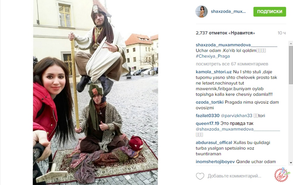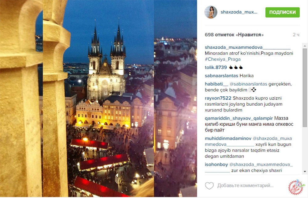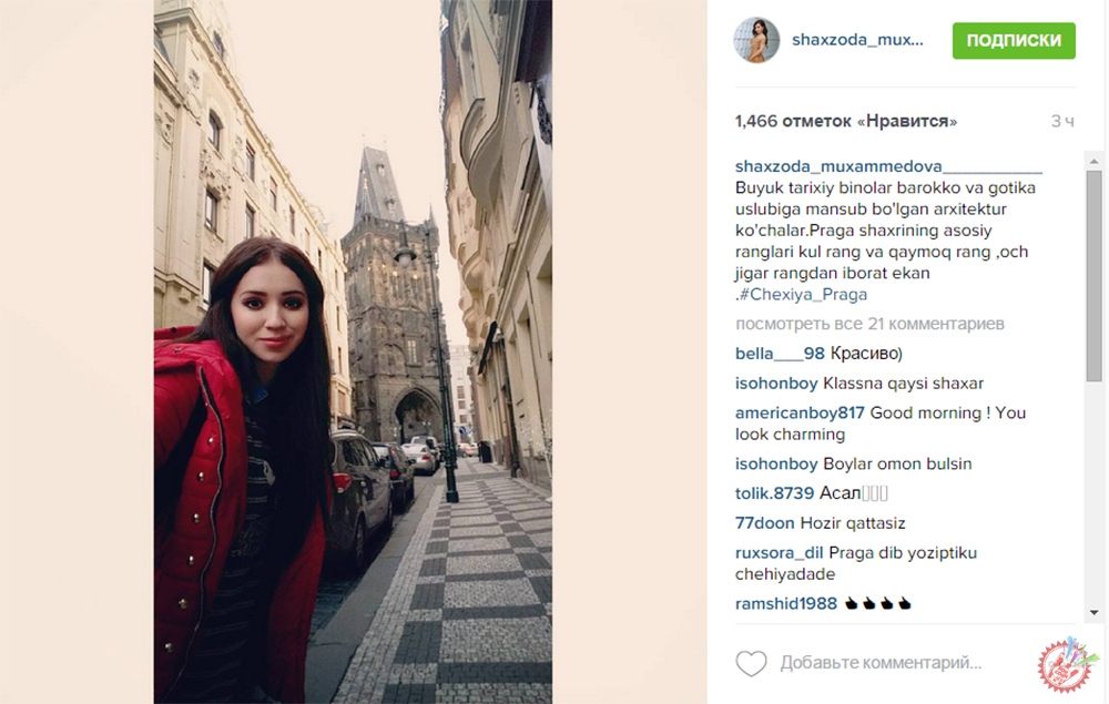Айни дамда янги телелойиҳа учун бир нечта давлатлар узра саёҳат уюштирган серқирра ижодкор Шахзода Муҳамедова инстаграм ижтимоий тармоғи орқали қизиқарли маълумотларни етказишдан чарчамаяпти. Бу сафар учун олдиндан маълумотлар йиғиб, ўқиб-ўрганган актриса саёҳатни Чехия пойтахти Прага шаҳридан бошлаб юборди. Шахзода саёҳат давомида кўплаб фотосуратлар, видеолавҳаларни инстаграм ижтимоий тармоғи орқали кузатувчилари билан бўлишмоқда. Шунингдек, қизиқарли маълумотларни етказмоқда. Бу ҳали бошланиши. Ҳали олдинда яна бир нечта давлатларда бўлиб ўтадиган саёҳат кутмоқда. Демак, кузатишда давом этинг.