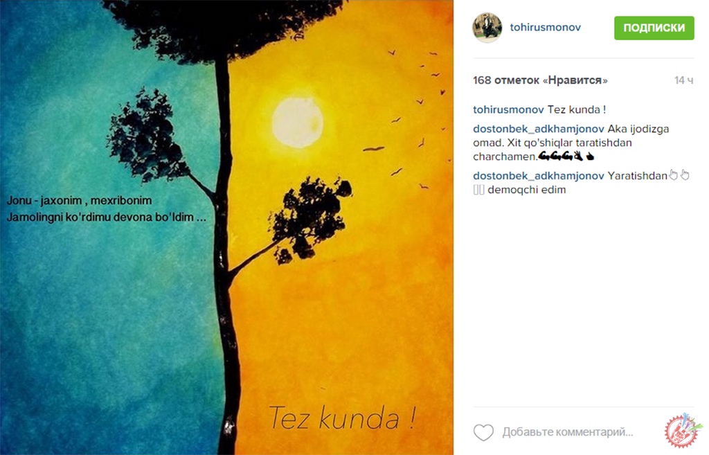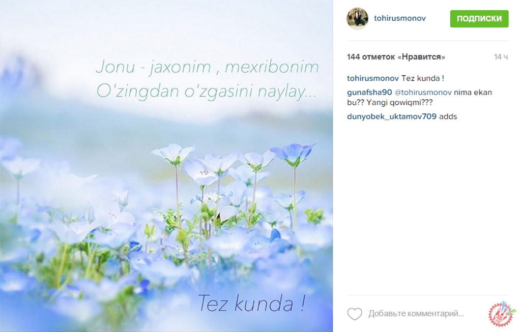 Инстаграм ижтимоий тармоғида Тоҳир Усмонов яқин кунларда премьераси кутилаётган янги ижод маҳсули ҳақида хабар қолдирди. Таронанинг мисралари акс этган бир нечта фотосуратлар қисқа фурсатда ижтимоий тармоқда шиддат билан тарқалди. Хонанданинг ҳамкасблари ҳамда мухлисларни бирдек қизиқтираётган тарона тез кунда тақдим этилади. Ҳозирча кузатамиз.