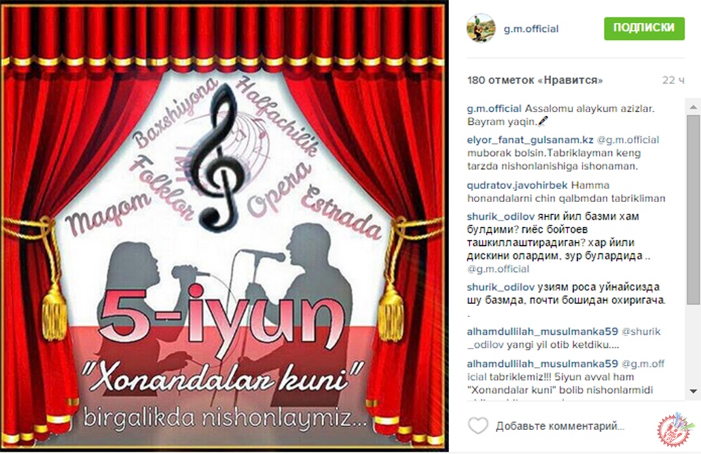 Инстаграм ижтимоий тармоғида “5-июнь хонандалар куни” мавзуси кўпгина баҳс-мунозараларга сабаб бўлмоқда. Кўпгина ижодкорларнинг маълум қилишича, эндиликда хонандалар куни нишонланади. Бироқ, аниқ маълумотлар ва шу мавзуга доир саволларни санъанкорлар очиқ қолдиришмоқда.