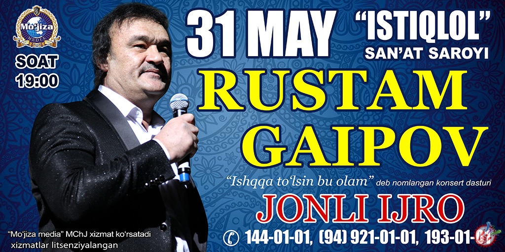 Элимиз ардоғидаги хонанда Рустам Гаипов май ойининг сўнгги кунида “Истиқлол” санъат саройида жонли ижродаги яккахон концерт дастурини тақдим этади. “Ишққа тўлсин бу олам” деб номланган дастурда фақат бир кун бўлиб ўтади. Жонли ижрони соғинганлар учун бу хабар муносиб туҳфа бўлса ажаб эмас. Мазкур дастур ҳақида батафсил маълумотларни сайтимиз орқали кузатиб боринг. Биздан асло йироқлашманг.