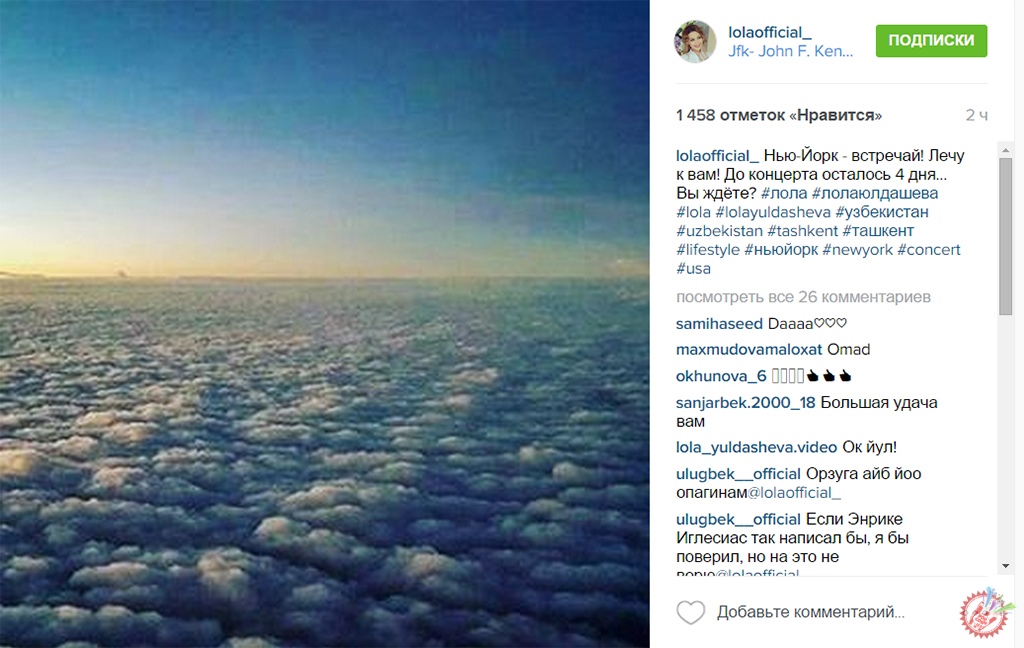 Маълумки, латофатли Лола 30-апрель куни Нью-Йоркда ўз концерт дастурини тақдим этади. Бугун у океан орти томон йўл олди. Бу ҳақида у ўзининг инстаграмдаги шахсий саҳифаси орқали хабар қолдирди.