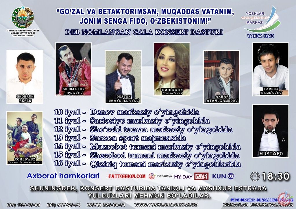 “Гўзал ва бетакроримсан, муқаддас Ватаним, жоним сенга фидо, Ўзбекистоним!” номли гала-концерт дастурини тақдим этади.