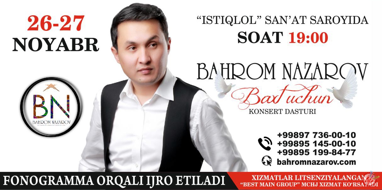 Баҳром Назаров Сана: 28.09.2016 10243 0 1 2 3 4 5 Йил: 2016 Куни: 26-, 27-noyabr Вақти: 19:00 Жойи: "Istiqlol" san'at saroyi Номи: "Бахт учун"