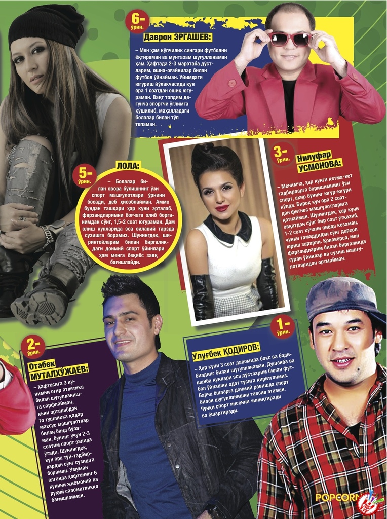 Журналнинг 4-сони сиз учун қизиқарли саҳифаларни тақдим этади. Улар орқали шоу-бизнес вакилларига ўзгача нигоҳ билан қарашингиз мумкин. Юлдузларимизнинг спортга муносабатлари қандай эканлигини билмасангиз керак?! Улардан қай бири спорт билан мунтазам шуғулланишини-чи? Бу борада аниқ фактлар асосида тузилган рейтинг орқали хонандаларнинг ҳаётида спортнинг ўрни қандай эканлигини билиб оласиз.
