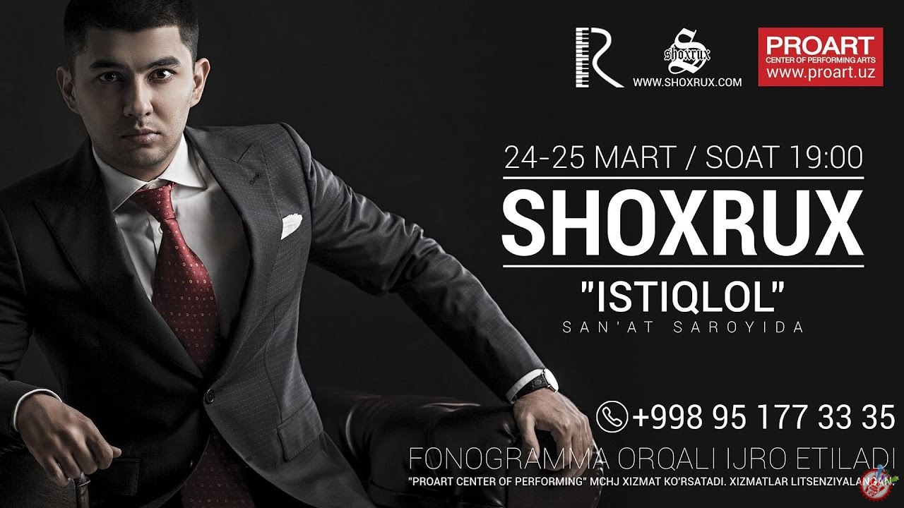 Shoxrux - "10 yillik ijodim" Сана: 25.12.2016 8186 100 1 2 3 4 5 Йил: 2017 Куни: 24-25-март Вақти: 19:00 Жойи: "Истиқлол" санъат саройи Номи: "10 йиллик ижодим"