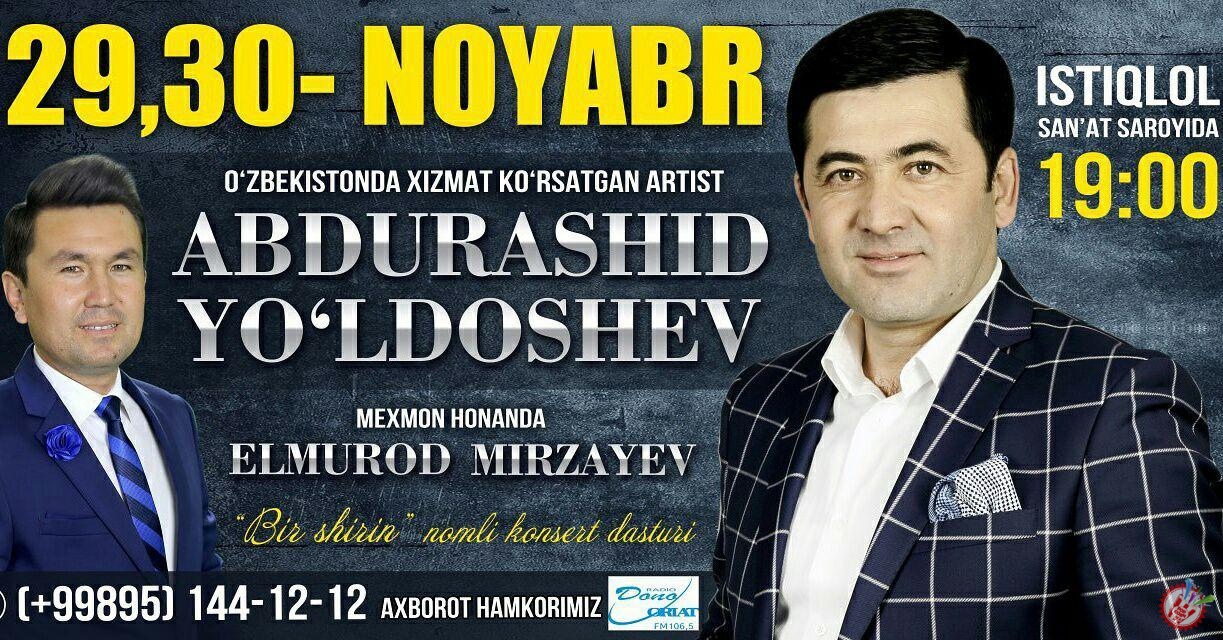 Ўзбекистонда хизмат кўрсатган артист Абдурашид Йўлдошев 29, 30 ноябрь кунлари "Истиқлол" санъат саройида ўзининг навбатдаги яккахон концерт дастурини ўтказади. Дастур "Бир ширин" деб номланган. Концерт меҳмони Элмурод Мирзаев. Хонанда барча мухлисларини ушбу концерт дастурига таклиф этади.