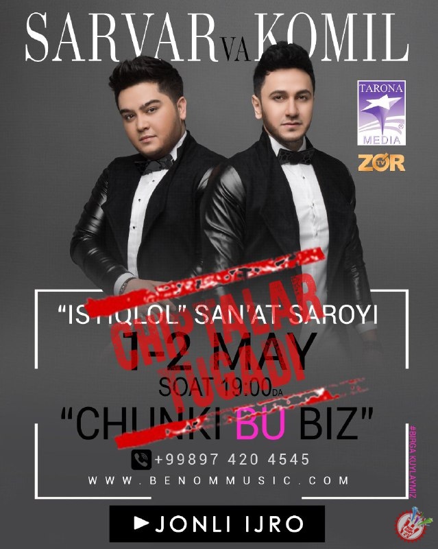 Серқирра ижодкорлар Сарвар ва Комилнинг 1, 2 май кунлари "Истиқлол" санъат саройида бўлиб ўтадиган "Чунки бу биз" номли жонли ижродаги концерт дастурига чипталар қолмади. Концертнинг охирги чиптаси бугун сотиб бўлинди. Концерт дастурига саноқли кунлар қолган Сарвар ва Комил ҳар бир мухлисидан миннатдор. Бу ҳолат албатта концерт дастурини тақдим этаётган ҳар бир санъаткор учун қувонарли ҳолат. Сарвар ва Комилни ва уларнинг ижодий жамоасини табриклаймиз. Киноконцерт юқори даражада бўлиб ўтишига ишонамиз ва омад тилаб қоламиз.