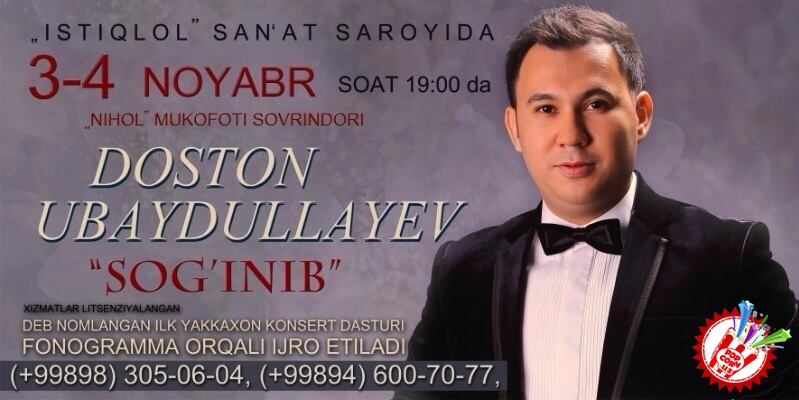 3 – 4 ноябрь кунлари мухташам «Истиқлол” санът саройида Ниҳол мукофоти совриндори Достон Убайдуллаевнинг “Соғиниб” деб номланган яккахон гала концерти бўлиб ўтади. Концертга тайёргарлик қандай бўлётгани билан қизиқдик.
